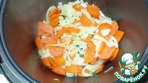 • Отправляем в чашу масло, лук и морковь — Режим «Жарка» 8 минут (Не забываем перемешивать каждые 2-3 минуты. Крайне желательно жарку проводить с открытой крышкой).