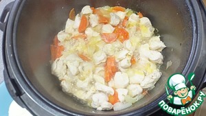 • Добавляем в чашу курицу — Режим «Жарка» 12 минут (Не забываем перемешивать каждые 2-3 минуты.)