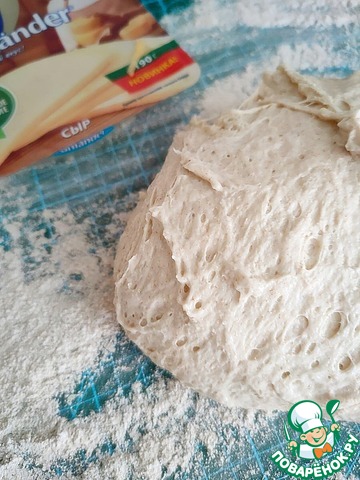 Рабочую поверхность хорошо подпылите мукой. Выложите тесто. Присыпьте его мукой.