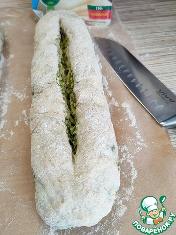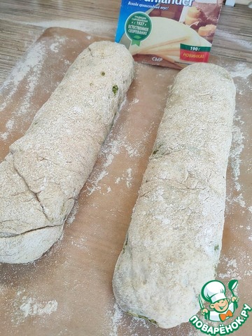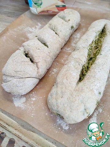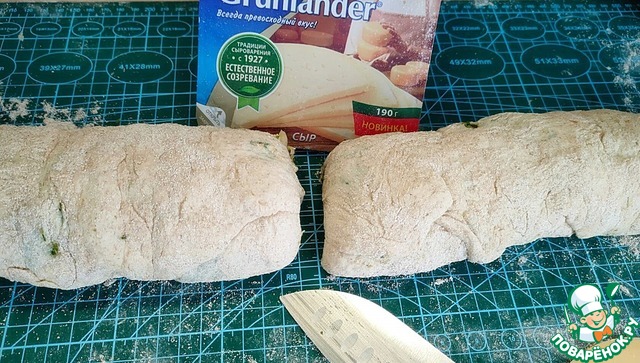 Лист пергамента припылите мукой. Переложите на него две заготовки на некотором расстоянии друг от друга. Сделайте на хлебе надрезы.