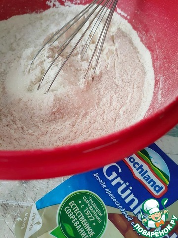 Приготовьте тесто. Просейте в глубокую миску оба вида муки. Добавьте сахар и соль. Всё хорошо перемешайте.