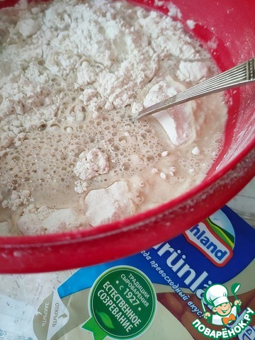 Вылейте дрожжевую смесь в муку. Начните замешивать тесто, с помощью ложки.