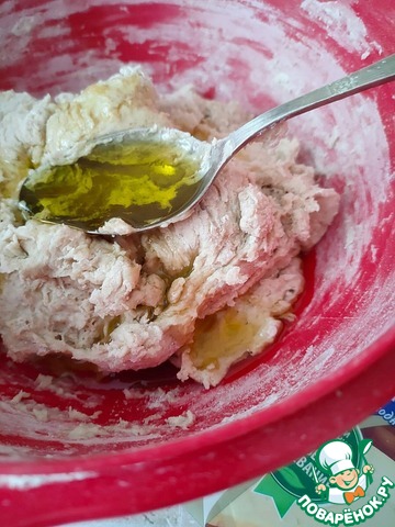 Затем влейте оливковое масло и месите еще несколько минут, до однородности.