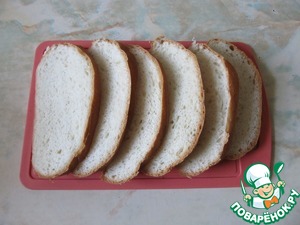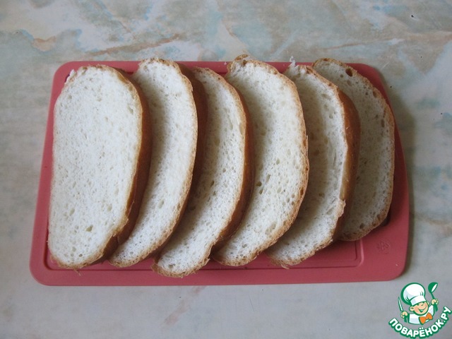 • Батон нарезать наискосок крупными ломтями. На 3 порции понадобится 6 ломтей.