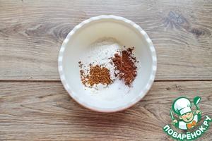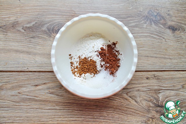 В миску просейте муку, какао, добавьте кофе, разрыхлитель, соль и сахар, перемешайте.