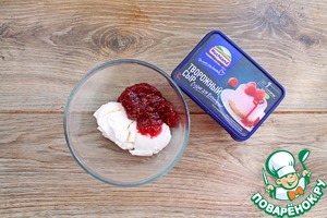 Творожный сыр тщательно перемешайте с вареньем и сливками.
