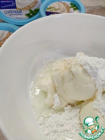 Этим временем подготовьте начинку. В миске смешайте до однородности - творожный сыр, сахарную пудру и ликёр. Если готовите для детей ликёр можно не добавлять.