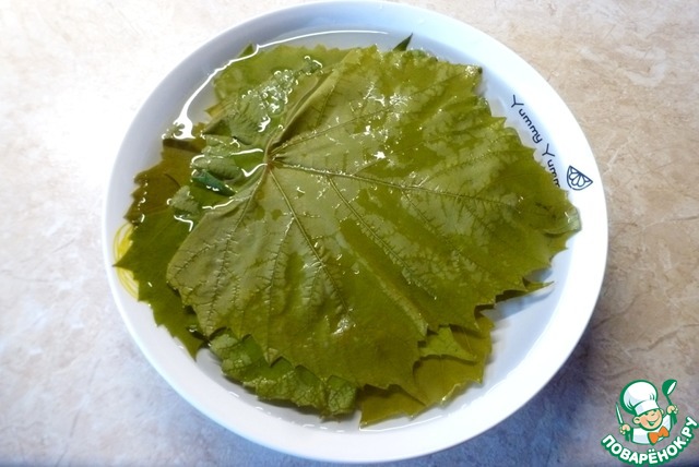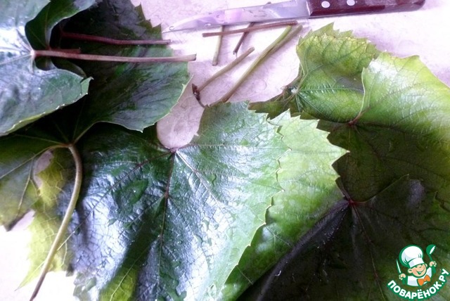 Молодые листья винограда хорошо промыть водой, обрезать черешки.
