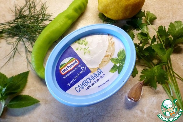 Для начинки подготовить сливочный сыр ТМ Хохланд, перец чили, чеснок, лимон, кинзу, укроп, мяту. Зелень можно взять любую, на свой вкус.