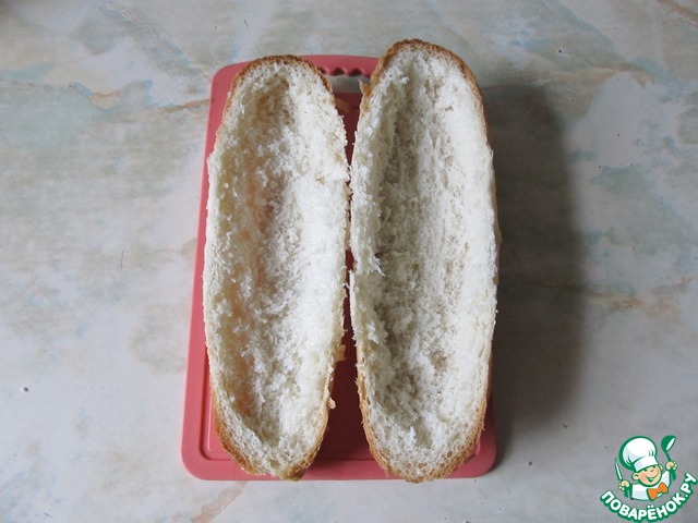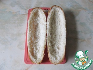 Багет разрезать вдоль пополам и вынуть мякиш.