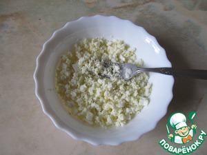 Добавить размягчённое масло, сливочный сыр и натёртый на мелкой тёрке полутвёрдый сыр. Посолить и приправить сухими травами и перцем. Хорошо перемешать.