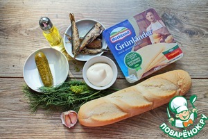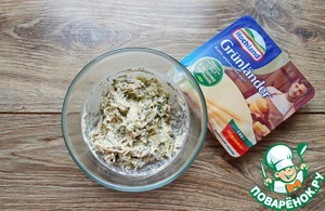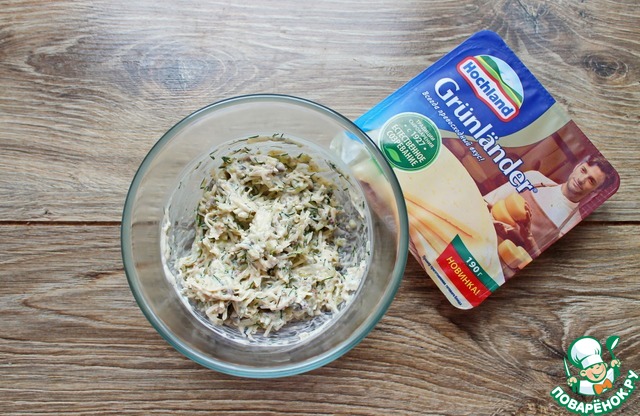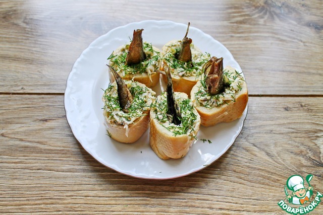 На средней терке натрите твердый сыр и положите в миску. У шпрот отделите самые красивые хвостики по количеству хлебных стаканчиков (прибавьте парочку на всякий случай), остальное измельчите и добавьте к сыру. Корнишон мелко порежьте и положите в миску, туда же мелко порезанный укроп, оставив немного для украшения.