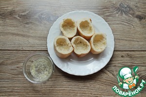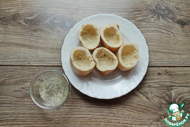 Мини багет разрежьте на куски и удалите мякиш, оставив дно и стенки. Чеснок натрите и смешайте с растительным маслом. Смажьте стаканчики из багета масленой смесью изнутри и снаружи. Поставьте в горячую духовку и подсушите в течение 5-7 минут при температуре 180 градусов. Хлеб должен немного подсохнуть и подрумяниться, время зависит от вашей духовки.