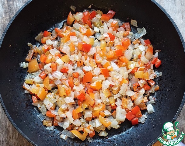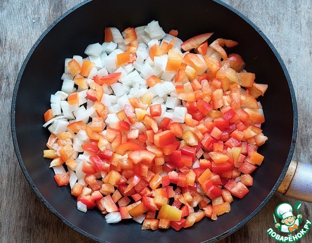 Лук почистить, помыть, нарезать кубиками. Болгарский перец помыть, очистить от семян, нарезать кубиками. В сковороду налить растительное масло (2 ст. л.), переложить лук и перец.