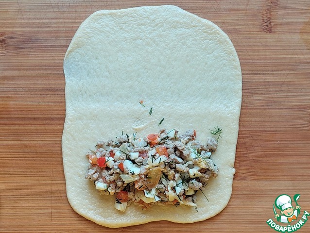 Тесто разделить, примерно, на 14 частей. Каждую часть раскатать в прямоугольник. На одну половинку выложить начинку (1.5-2 ст. л.).