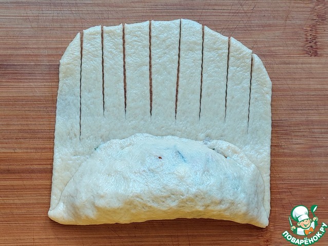 Свернуть край с начинкой. На другом краю сделать надрезы.