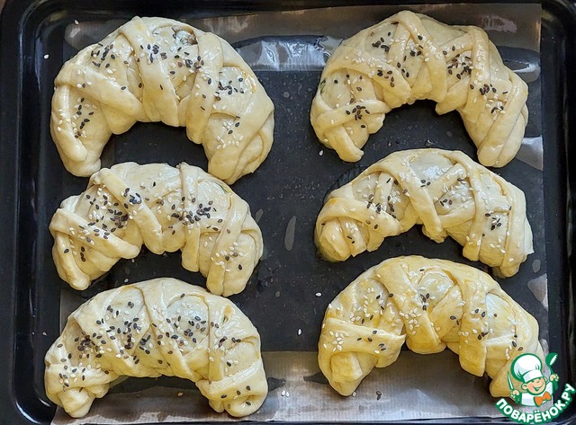 Противень застелить бумагой для выпечки и смазать растительным маслом. Переложить пирожки, я придала им форму полумесяца. Смазать яичным желтком и посыпать кунжутом. Готовить в духовке, заранее разогретой до 180 гр., 20-25 мин.