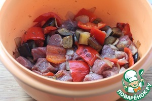 Выложить овощи к сырому мясу, добавить соль, перец и перемешать.
