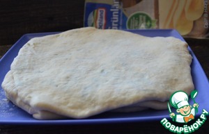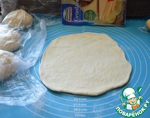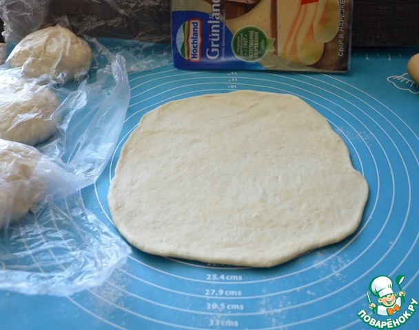 Колобок раскатать в тонкую лепёшку, 22-24 см..
