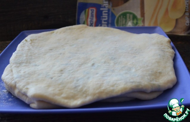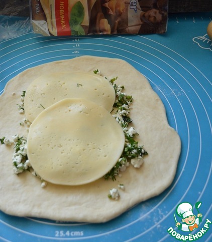 На центр лепёшки положить 2 ст. л. творога и два ломтика сыра. Завернув края, запечатать и раскатать заготовки, 24 см., при необходимости рабочее место припылять слегка мукой.