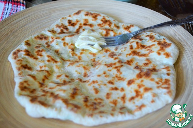 Дрожжевые лепёшки по мотивам кавказских хычинов и чуду, с творогом и разной ароматной зеленью, с обилием полутвёрдого сыра. Сытные и вкусные - хороши горячие, с пылу, с жару. Ничуть не хуже и остывшие, так что очень удобно взять их на пикник, на перекус в дорогу и т. п.. Рекомендую.
