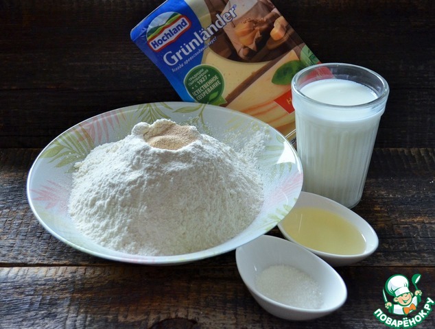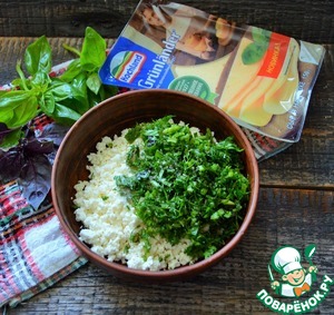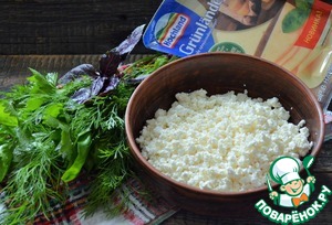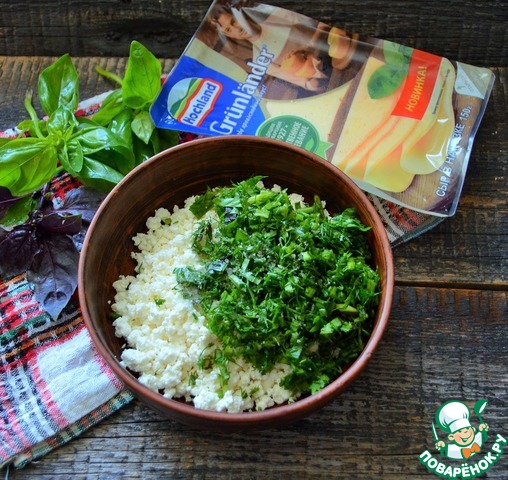 В это время приготовить начинку, творог слегка подсолить, зелень вымыть, обсушить. Я использую полутвёрдый сыр Грюнландер ТМ "Hochland", причём производитель позаботился о тонкой нарезке, что очень удобно.