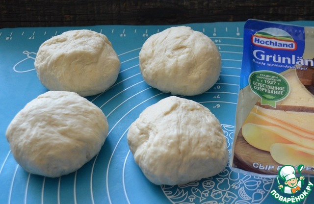Выбродившее тесто обмять, разделить на 4 одинаковых части, подкатать в колобки, накрыть, оставить на 10 минут.