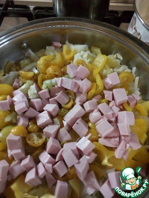 Колбасу режем кубиками и добавляем к овощам.