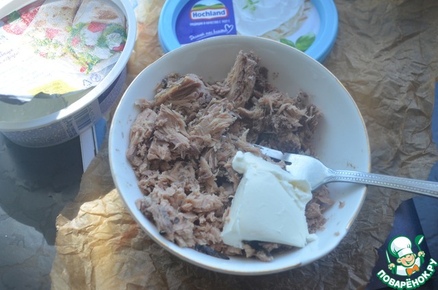 В миске тунец ( слив жидкость) разомните вилкой, добавьте творожный сыр. ( по желанию можно добавить мелко нарубленный лук), а кто любит по острее горчицу, щепотку перца. Перемешайте.