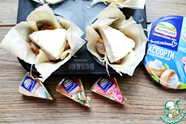 На мясо уложите по одному треугольничку плавленого сыра, немного вдавив. Если возьмете, как я, сырное ассорти, то у вас получатся разные по вкусу.