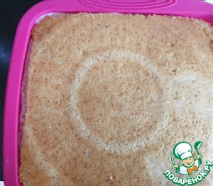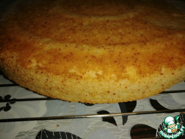 Противень застелить пергаментом, поставить выпекаться в разогретую до 165 градусов на 30-40 минут до сухой зубочистки. Приоткрыть духовку на 10 минут после выпекания и отключения духовки, затем извлечь бисквит из духовки и положить на сетку до полного остывания (снять пергамент и освободить от формы)