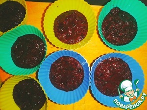 Желе разлить в силиконовые формы и отправить в морозильную камеру до полного застывания. Использовала формы для кексов (9 штук), можно дно пекарского кольца затянуть пищевой плёнкой и использовать для приготовления желе, тогда в торте желе будет сплошный слоем.