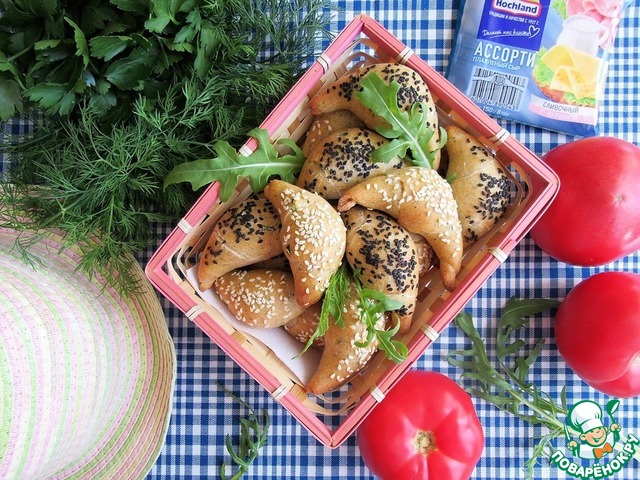 Закусочные цельнозерновые творожные рогалики с рукколой, маслинами и плавленым сыром "Ассорти", в состав которого входят классический сливочный сыр и сыр с ветчиной. Вкусная и полезная выпечка для пикника. Попробуйте!
