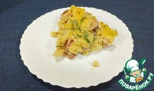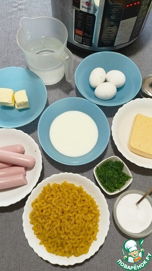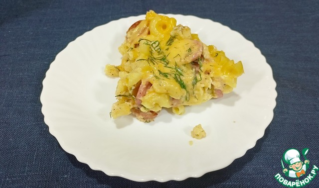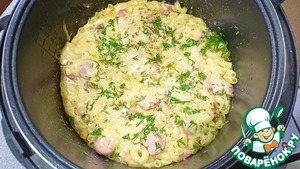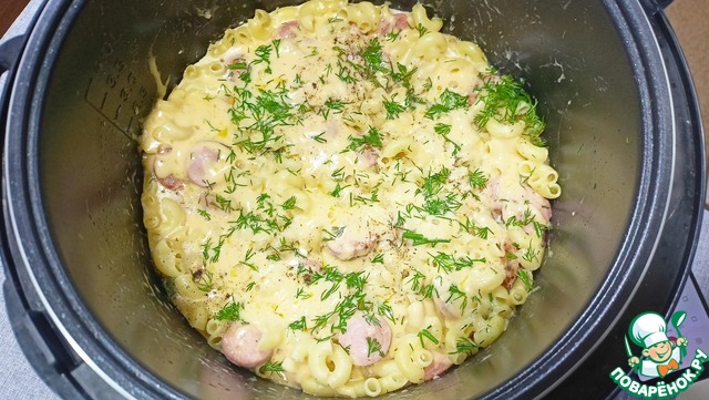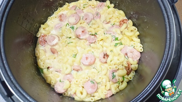 Смешиваем молоко и 2/3 сыр, 1/2 укропа и яйца. В чашу сначала отправляем масло и тщательно перемешиваем с макаронами. Далее отправляем сосиски, и заливаем нашей «молочной смесью». После чего специи и тщательно перемешать - Режим «Выпечка» 25 минут.
