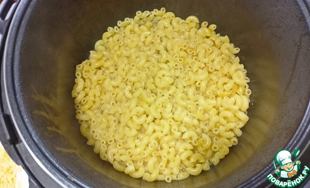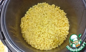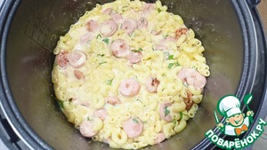 Достаем сосиски и отправляем в чашу макароны и воду — Режим «Тушение» 15 минут (Либо на режиме "Паста", сколько требуется времени)