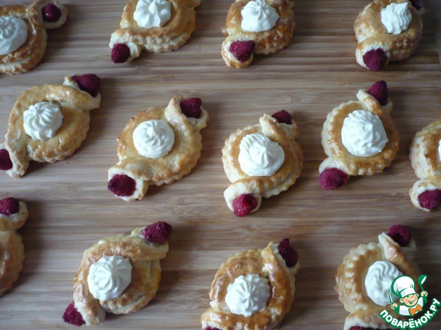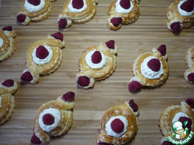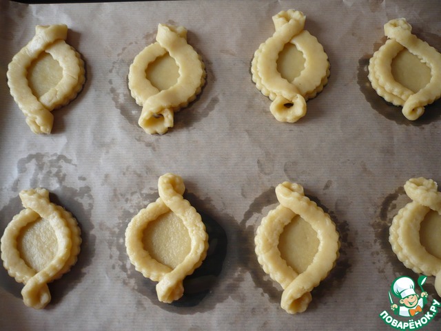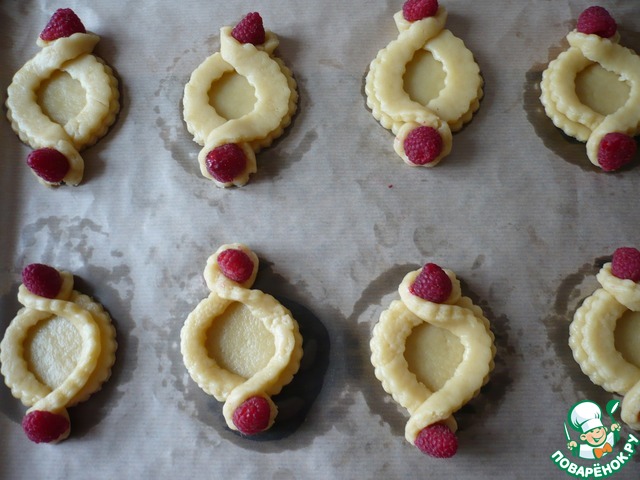 В получившиеся "петельки" печенья вложите по малинке (можно любую ягоду). Печенье смажьте яичным желтком.