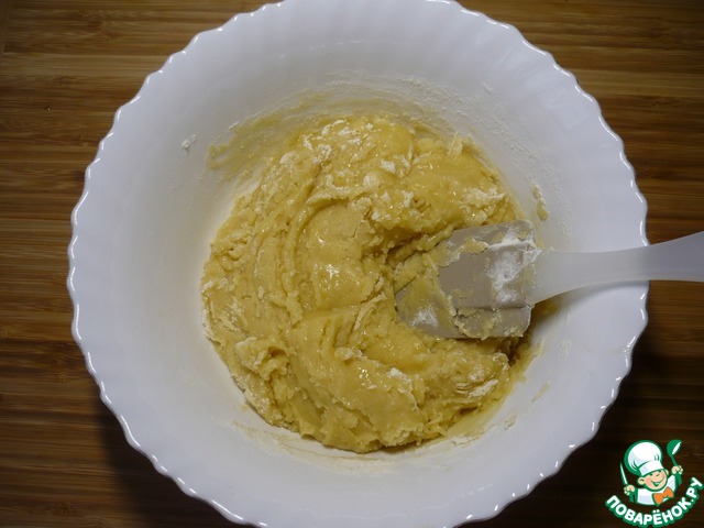 Затем в жидкость частями всыпьте просеянную муку и добавьте разрыхлитель теста. Замесите тесто, постепенно, добавляя оставшуюся муку, оставьте тесто на 10 минут.
