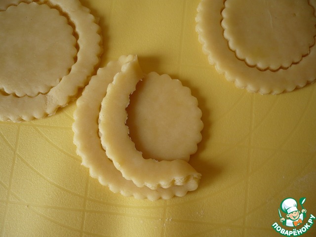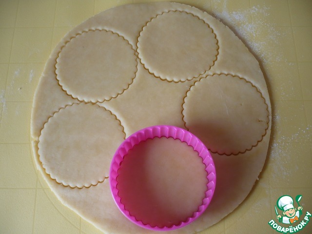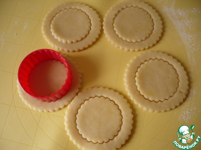 Раскатайте тесто в пласт толщиной ~ 3 мм и с помощью вырубки диаметром - 9 см вырежьте печенье.