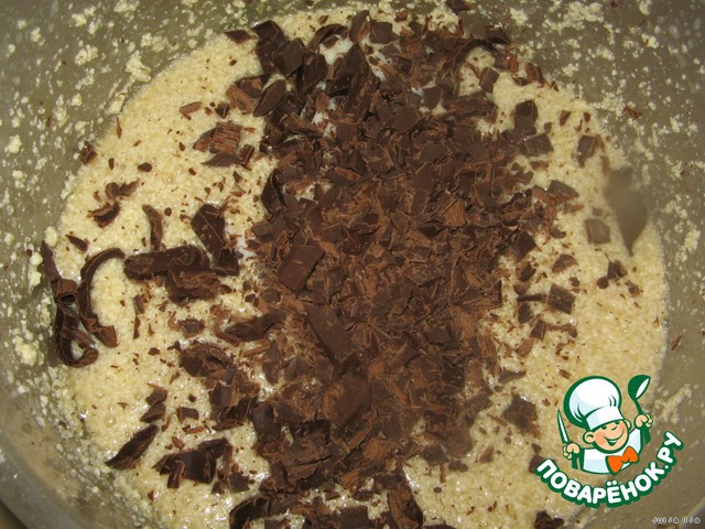 В тесто нарежем шоколад. Можно натереть на тёрке, но тогда не получится вкуснейших шоколадных "островков". Поэтому у меня часть шоколада нарезана мелко, а часть покрупнее. И добавляем остывший кофе.