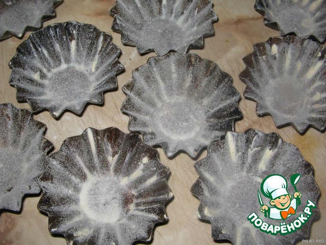 Формочки (а у меня старинные, железные), смазать сливочным маслом и посыпать манкой или мукой.