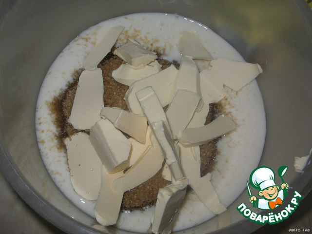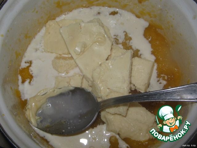 И белый шоколад. У меня был пористый, поэтому я его просто поломала, а потом размяла ложкой. Если шоколад будет обычный, его лучше натереть на тёрке, чтобы быстрее растворился.