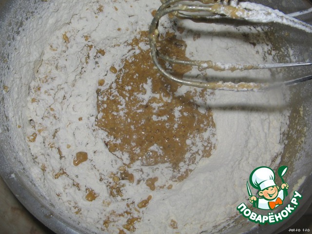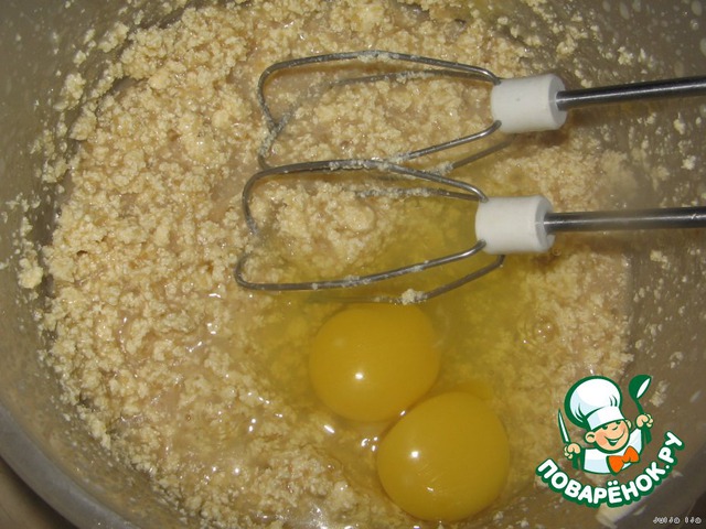 Чайную ложку разрыхлителя. Можно заменить просто гашеной уксусом содой (0,5 чайной ложки).
