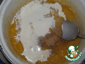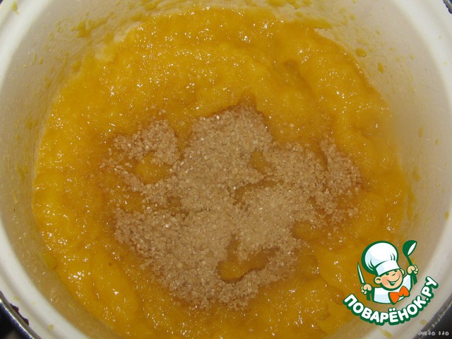 Добавляем немного сахара. Здесь по вкусу. Всё зависит от сладости манго. Признаюсь честно - я добавила сахар зря. У меня и манго оказалось очень сладким (на удивление), плюс ещё шоколад даёт свою сладость. Но я делала эти кексики первый раз, эксперементировала, в будущем буду умнее.