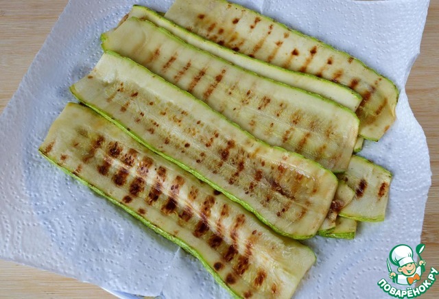• Разогреть гриль и обжарить кабачковые слайсы до мягкости.