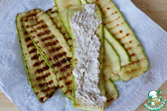 • Каждый слайс кабачка смазать сливочной начинкой и свернуть в рулет.