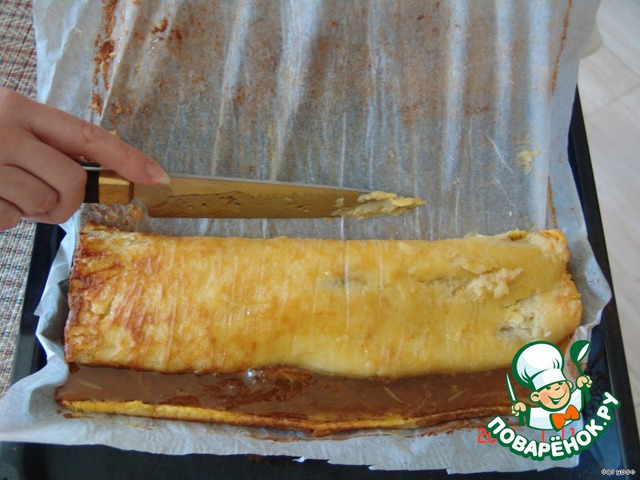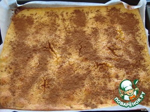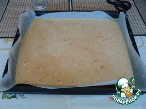 На металлический лист от духовки стелим широкий пергамент, хорошо смазанный сливочным или растительным маслом. На пергамент выливаем жидкое тесто. Сразу ставим в предварительно разогретую до 180*С духовку и выпекаем 20 минут.