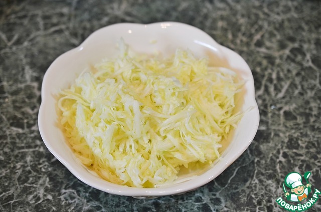 Посолите, оставьте на 5 минут. Хорошо отожмите лишнюю жидкость.