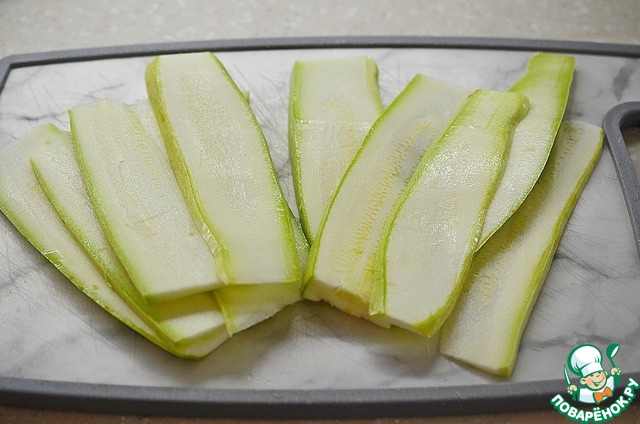 Кабачок нарежьте на тонкие слайся. Берите молодые кабачки, с мелкими семенами.