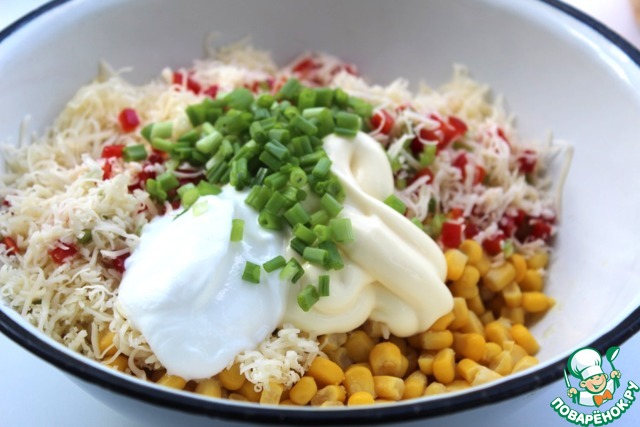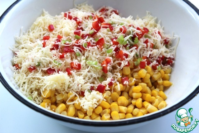 С кукурузы слить жидкость и выложить к сыру и перцам.