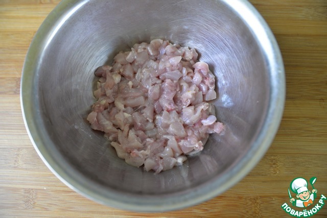 Куриное филе мелко режем, у меня, из бедра, оно нежнее и жирнее, чем из грудки.